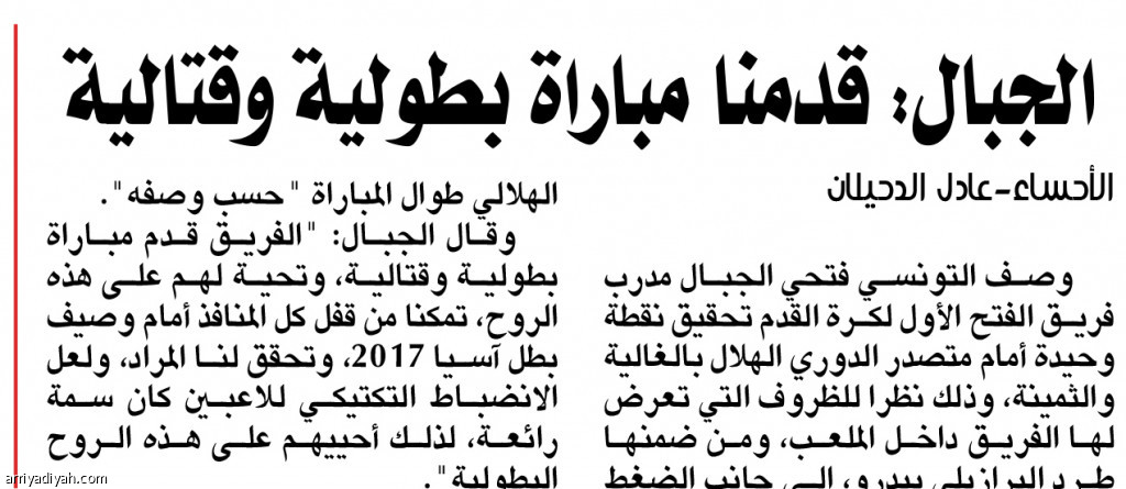 وقال الجبال: "الفريق قدم مباراة بطولية وقتالية، وتحية لهم على هذه الروح، تمكنا من قفل كل المنافذ أمام وصيف بطل آسيا 2017، وتحقق لنا المراد، ولعل الانضباط التكتيكي للاعبين كان سمة رائعة، لذلك أحييهم على هذه الروح البطولية".