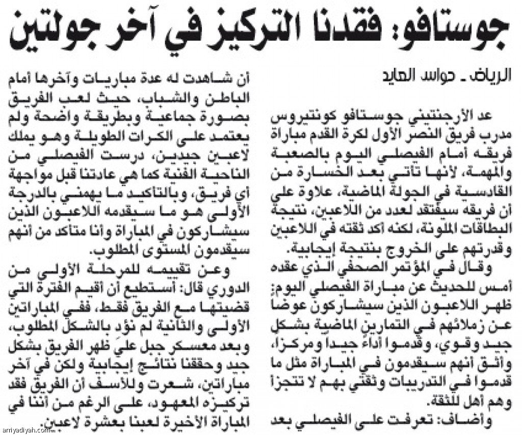 وأضاف: تعرفت على الفيصلي بعد أن شاهدت له عدة مباريات وآخرها أمام الباطن والشباب، حيث لعب الفريق بصورة جماعية وبطريقة واضحة ولم يعتمد على الكرات الطويلة وهو يملك لاعبين جيدين، درست الفيصلي من الناحية الفنية كما هي عادتنا قبل مواجهة أي فريق، وبالتأكيد ما يهمني بالدرجة الأولى هو ما سيقدمه اللاعبون الذين سيشاركون في المباراة وأنا متأكد من أنهم سيقدمون المستوى المطلوب.