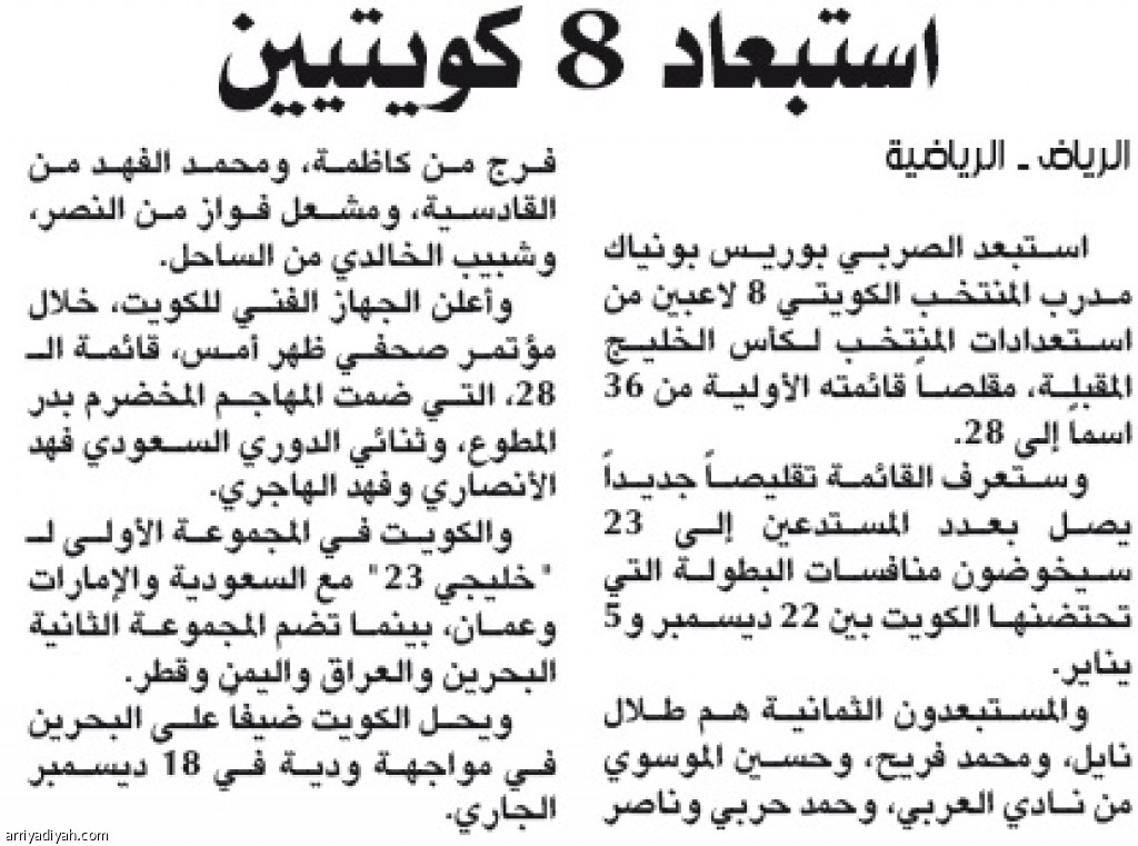 والمستبعدون الثمانية هم طلال نايل، ومحمد فريح، وحسين الموسوي من نادي العربي، وحمد حربي وناصر فرج من كاظمة، ومحمد الفهد من القادسية، ومشعل فواز من النصر، وشبيب الخالدي من الساحل.