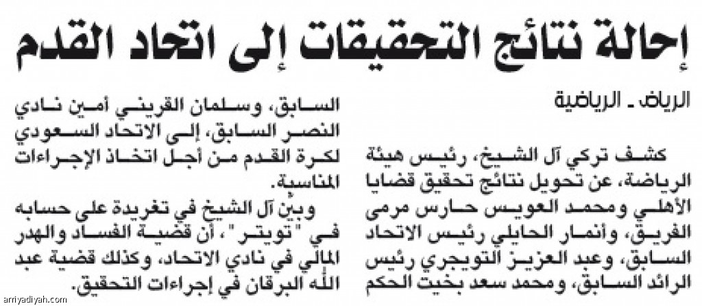 كشف تركي آل الشيخ، رئيس هيئة الرياضة، عن تحويل نتائج تحقيق قضايا الأهلي ومحمد العويس حارس مرمى الفريق، وأنمار الحايلي رئيس الاتحاد السابق، وعبد العزيز التويجري رئيس الرائد السابق، ومحمد سعد بخيت الحكم السابق، وسلمان القريني أمين نادي النصر السابق، إلى الاتحاد السعودي لكرة القدم من أجل اتخاذ الإجراءات المناسبة.