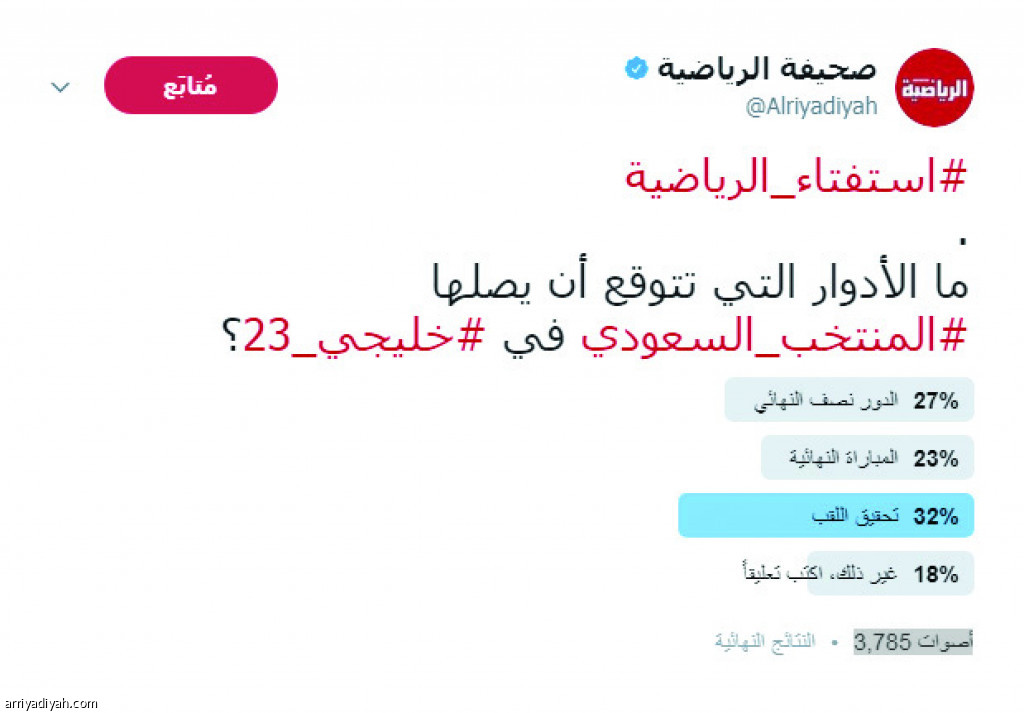 وكانت "الرياضية" قد نشرت استفتاء قالت فيه: "ما الأدوار التي تتوقع أن يصل إليها المنتخب السعودي في خليجي 23؟"