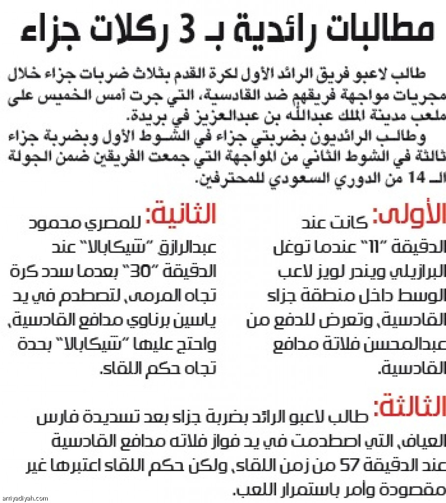 طالب لاعبو فريق الرائد الأول لكرة القدم بثلاث ضربات جزاء خلال مجريات مواجهة فريقهم ضد القادسية، التي جرت أمس الخميس على ملعب مدينة الملك عبدالله بن عبدالعزيز في بريدة.