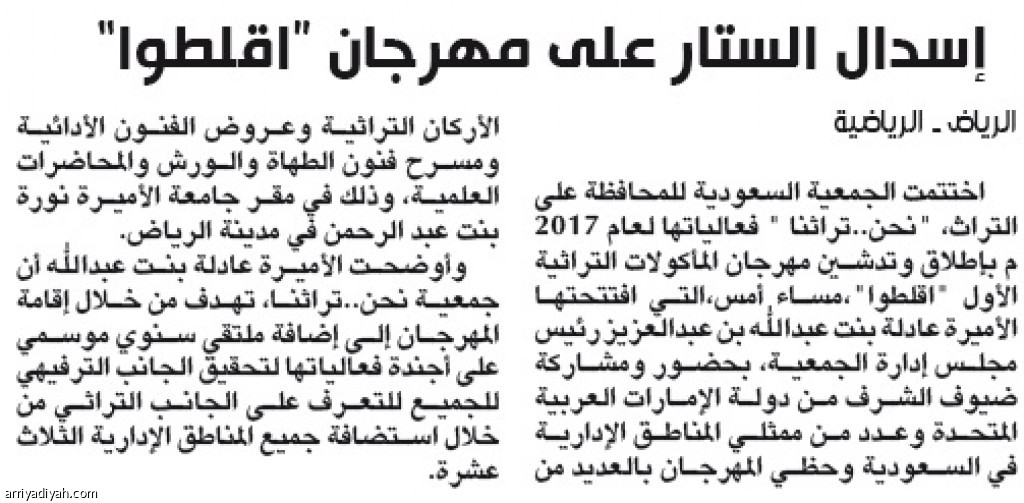 اختتمت الجمعية السعودية للمحافظة على التراث، "نحن..تراثنا " فعالياتها لعام 2017 م بإطلاق وتدشين مهرجان المأكولات التراثية الأول "اقلطوا"،مساء أمس،التي افتتحتها الأميرة عادلة بنت عبدالله بن عبدالعزيز رئيس مجلس إدارة الجمعية، بحضور ومشاركة ضيوف الشرف من دولة الإمارات العربية المتحدة وعدد من ممثلي المناطق الإدارية في السعودية وحظي المهرجان بالعديد من الأركان التراثية وعروض الفنون الأدائية ومسرح فنون الطهاة والورش والمحاضرات العلمية، وذلك في مقر جامعة الأميرة نورة بنت عبد الرحمن في مدينة الرياض.