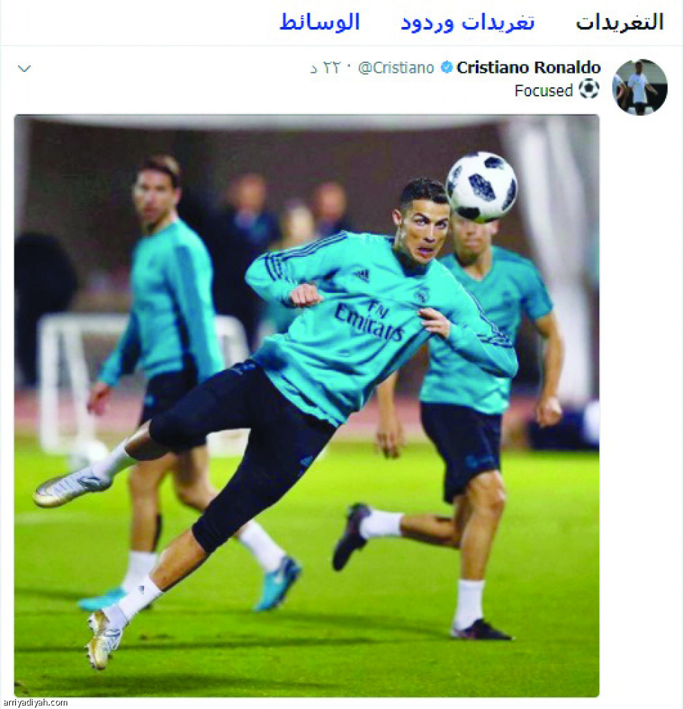 شارك البرتغالي كريستيانو رونالد لاعب فريق ريال مدريد الأول لكرة القدم، متابعيه عبر حسابه في موقع التواصل الاجتماعي تويتر بصورة له وهو يؤدي تدريباته في مدينة أبو ظبي الإماراتية، التي يوجد فيها الفريق للمشاركة في مونديال العالم للأندية.
