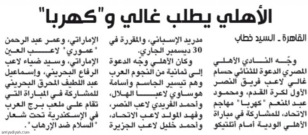 وجّـه النــادي الأهـلـي المصري الدعوة للثنائي حسام غالي لاعب فريق النصر الأول لكرة القدم، ومحمود عبد المنعم "كهربا" مهاجم الاتحاد، للمشاركة في مباراة الأهلي الودية أمام أتلتيكو مدريد الإسباني، والمقررة في 30 ديسمبر الجاري.