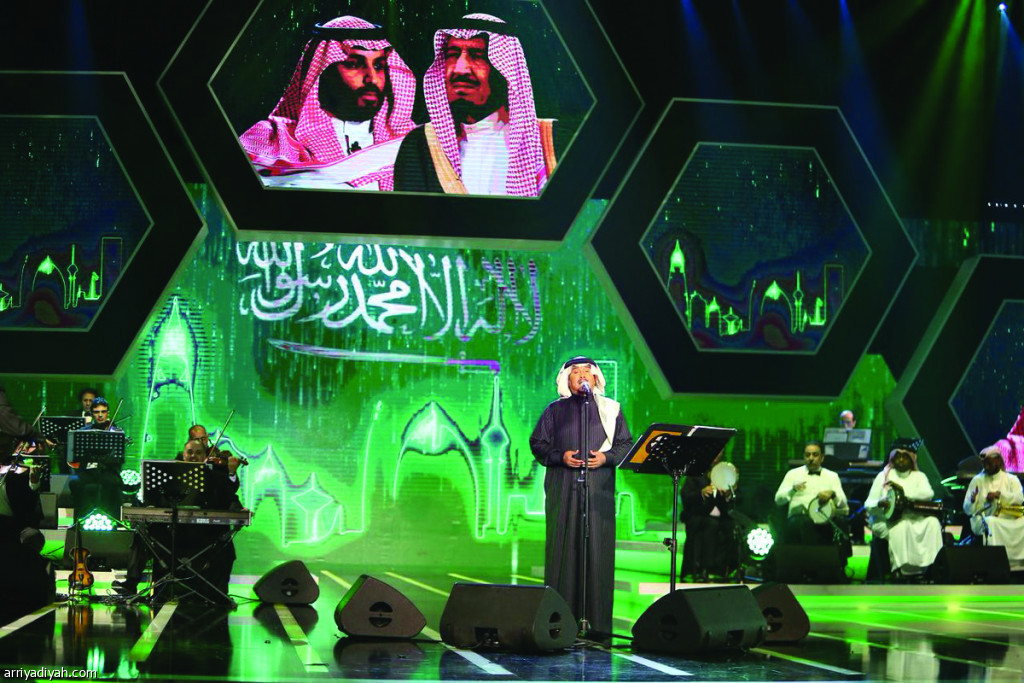 وصدح فنان العرب بأول أغنية في الحفل، وكانت الأغنية الشهيرة "الله أحد، وأرضي بعد" والتي غناها أول مرة في عهد الملك فهد رحمه الله، وقام بالأمس بتجديد عدد من كلماتها، ويغني بعدها "في الليالي الوضح.. والعتيم الصبح.. لاح لي وجه الرياض.. في مرايا السحب"، ومن ثم غنى "يا نصيبي من الصور.. والرسايل.. ومن كل شمس قايمة.. ومن كل ظل مايل"، ومن بعدها غنى رائعة بدر عبدالمحسن "وين أحب الليلة.. وين أهيم.. ارفعي طرقة الشيله.. عن سديم"، ليغني بعدها أغنيته الخاصة بالمنتخب السعودي "قولوا يالله يالله خضر الفنايل، العب يا الأخضر العب ياشوت، لا تخلي فرصة تفوت"، ليختتم أغانيه بنشيد "فوق هام السحب"، الذي تفاعلت معه الجماهير الحاضرة بعاصفة من التصفيق وترديد الكوبليهات.