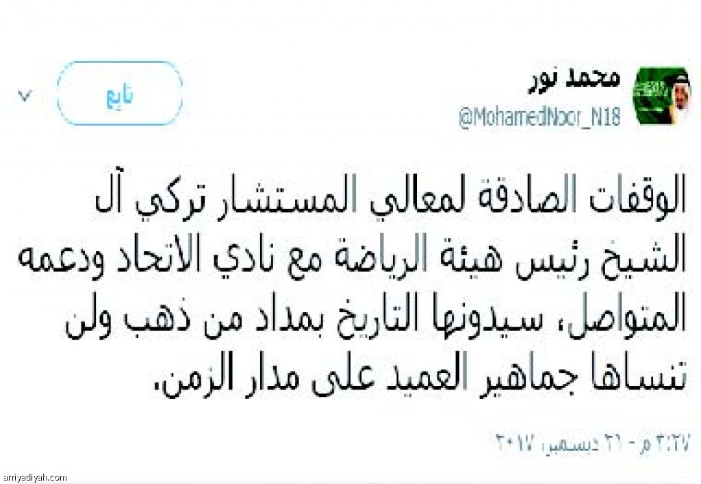 وكتب محمد نور عبر حســابه الخـــاص على "تويتر": "الوقفـات الصادقة للمستشار تركي آل الشيخ رئيس هيئة الرياضة مع نادي الاتحاد ودعمه المتواصل، سيدونهم التاريخ بمداد من ذهب، ولن تنساهم جماهير العميد على مدار الزمن".