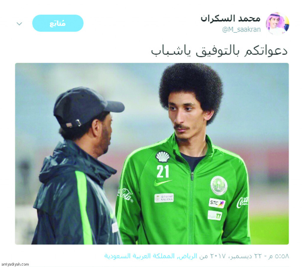 ونشر السكران صورة عبدالقدوس عطية لاعب المنتخب السعودي قبل انطلاق اللقاء، وعلق قائلاً: دعواتكم بالتوفيق يا شباب، لوجود شبه كبير بينه وبين لاعب المنتخب السعودي.