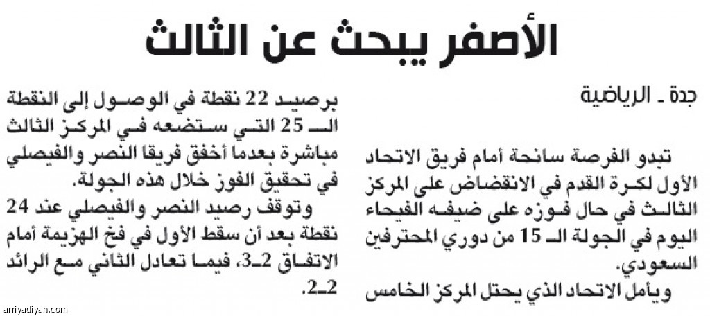تبدو الفرصة سانحة أمام فريق الاتحاد الأول لكرة القدم في الانقضاض على المركز الثالث في حال فوزه على ضيفه الفيحاء اليوم في الجولة الـ 15 من دوري المحترفين السعودي.