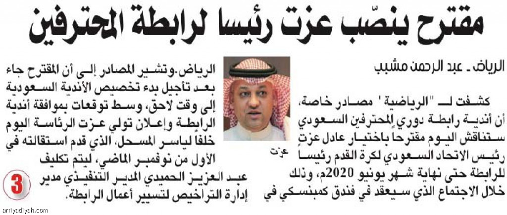 زكّى مجلس إدارة رابطة الدوري السعودي للمحترفين، عادل عزت رئيس الاتحاد السعودي لكرة القدم، رئيسا للرابطة حتى يونيو 2020.