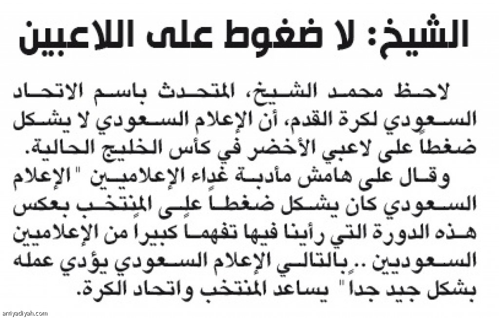 لاحظ محمد الشيخ، المتحدث باسم الاتحاد السعودي لكرة القدم، أن الإعلام السعودي لا يشكل ضغطاً على لاعبي الأخضر في كأس الخليج الحالية.