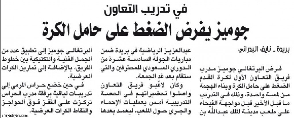 فرض البرتغالي جوميز مدرب فريق التعاون الأول لكرة القدم الضغط على حامل الكرة وبناء الهجمة من لمسة واحدة، وذلك في التدريب ما قبل الأخير قبل مواجهة الفيحاء على ملعب مدينة الملك عبدالله بن عبدالعزيز الرياضية في بريدة ضمن مباريات الجولة السادسة عشرة من الدوري السعودي للمحترفين والتي ستقام بعد غدٍ الجمعة.