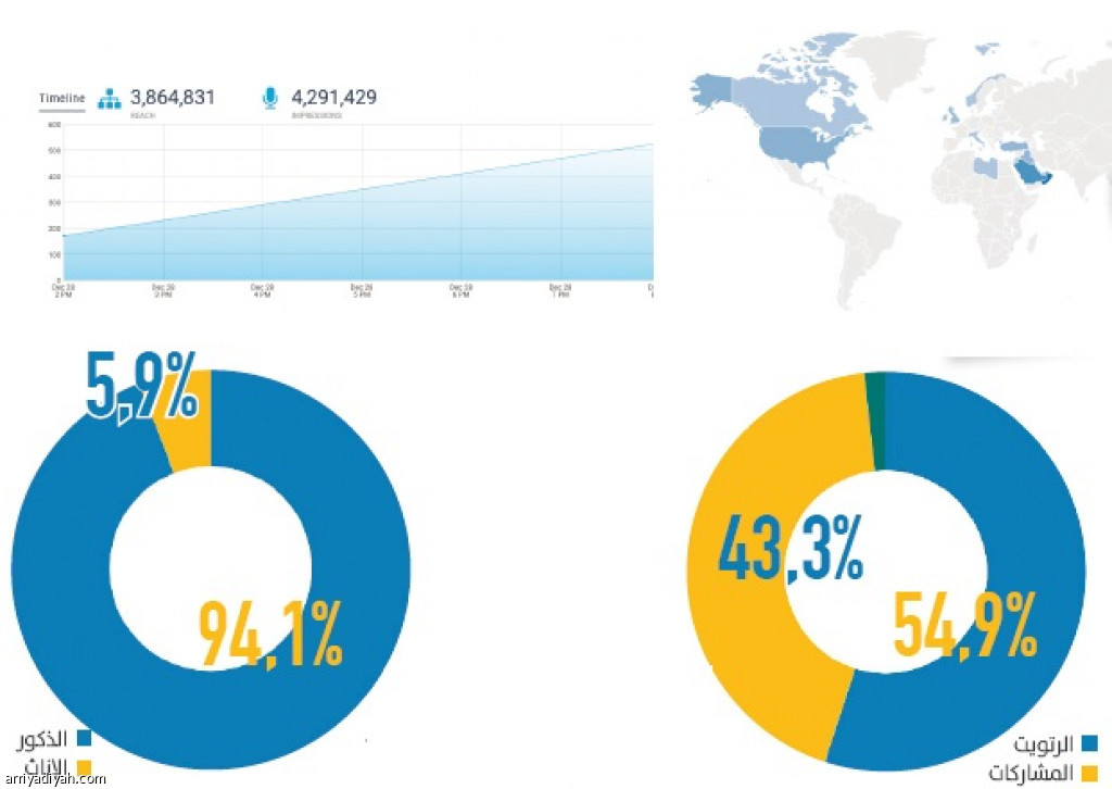 وجاء عدد المشاركين في الهاشتاق 3.864.831 مليون، وعدد زوار الهاشتاق 4.291.429 مليون زائر، وكانت أكثر المشاركات في الهاشتاق عمان بنسبة 43.65 في المئة، أما السعودية والكويت فحلتا ثانياً بنسبة 14.29 في المئة.