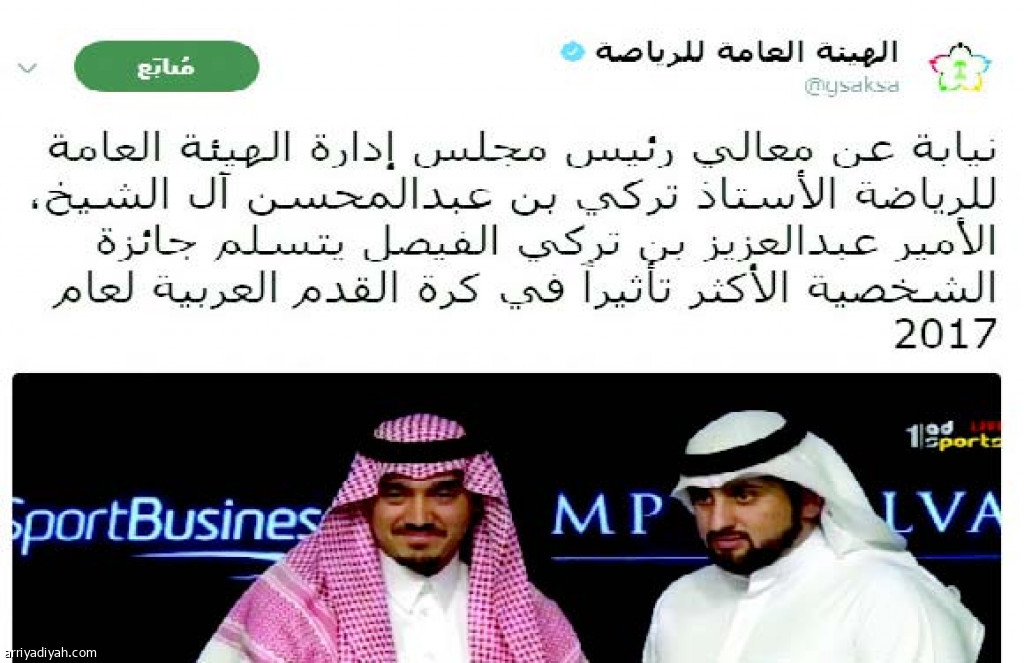 تسلم الأمير عبد العزيز بن تركي الفيصل أمس الخميس، نيابة عن تركي بن عبد المحسن آل الشيخ، رئيس مجلس إدارة الهيئة العامة للرياضة جائزة الشخصية الأكثر تأثيراً في كرة القدم العربية لعام 2017، وذلك خلال مؤتمر دبي الرياضي السنوي الذي أقيم في مدينة دبي في الإمارات.