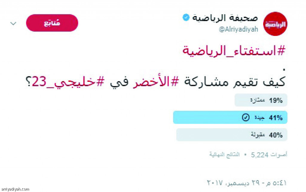 اتفق 41 في المئة من المصوتين عبر حساب "الرياضية" في تويتر على أن مشاركة المنتخب السعودي الأول لكرة القدم المشارك في بطولة خليجي 23 جاءت جيدة وذلك في التصويت الذي طرحته "الرياضية" حول مدى رضاهم عن مشاركة الأخضر في البطولة .