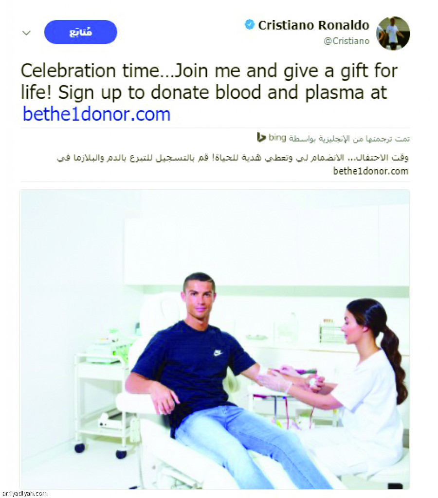 وجه البرتغالي كريستيانو رونالدو لاعب فريق ريال مدريد الأول لكرة القدم الدعوة لمتابعيه عبر حسابه الشخصي في موقع التواصل الاجتماعي تويتر من أجل التبرع بالدم وبلازما الدم .