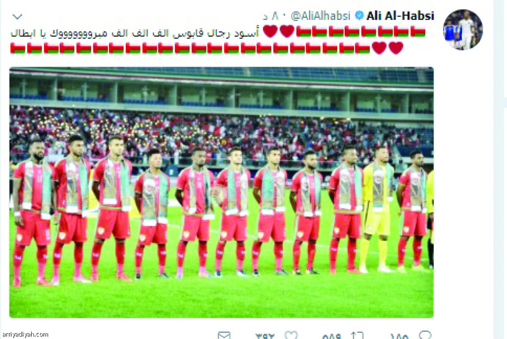 وكتب الحبسي عبر حسابه في تويتر تغريده قال فيها: أسود رجال قابوس ألف ألف ألف مبروك يا أبطال، كما أضاف من خلال أيقونة لعلم بلاده بعدد وصل إلى 30 مرة وصورة جماعية لزملائه في المنتخب.