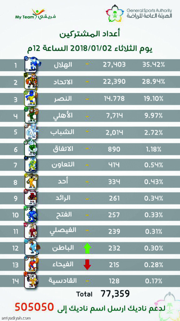ورفع الهلال عدد المشتركين لديه حتى الساعة 12 من ظهر أمس إلى 27,403 مشتركين وبفارق أكثر من أربعة آلاف مشترك عن صاحب المركز الثاني نادي الاتحاد بـ22,390 مشتركاً . وجاء النصر ثالثاً بـ14.778 مشتركاً ومن بعد الأهلي رابعاً بـ7،714 مشتركاً، ووصل عدد المشتركين في الحملة والتي تتم من خلال إرسال اسم النادي الراغب في الاشتراك به على الرقم 505050 إلى77359 مشتركاً.
