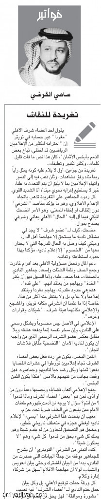 وكتب الزميل القرشي في مقاله: يقول أحد أعضاء شرف الأهلي "مغرداً" عبر حسابه في تويتر: إن "احترامه للكثير من الإعلاميين الرياضيين قد اختفى، تبـاع بعـض الـذمـم بأبخس الأثمان"، كان هذا نص ما فـات، قليـل كلمات، وكثير تكبير وتعليقات.