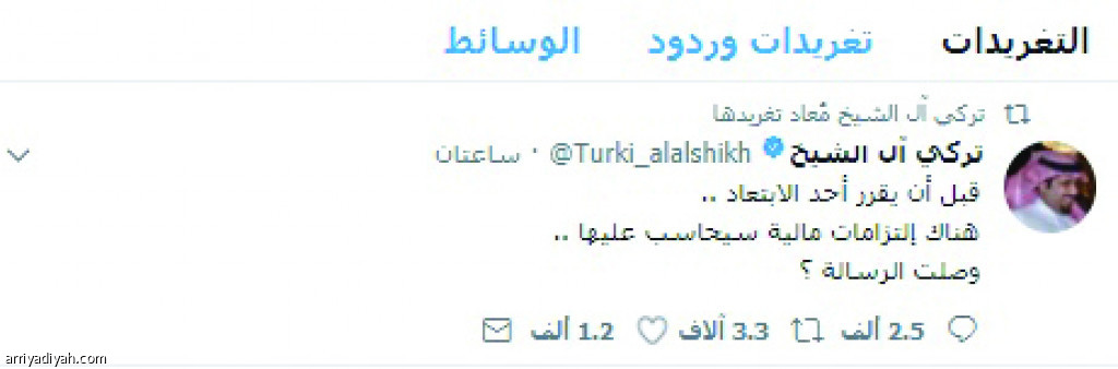 توعَّد المستشار تركي آل الشيخ، إدارات الأندية السعودية بالمحاسبة المالية في حال رغبة أعضائها مغادرة كرسي الرئاسة دون الإيفاء بالالتزامات المالية المترتبة عليهم. وكتب آل الشيخ عبر حسابه في "تويتر" تغريدة، قال فيها: قبل أن يقرِّر أحدهم الابتعاد، هناك التزامات مالية سيحاسب عليها. وصلت الرسالة؟".