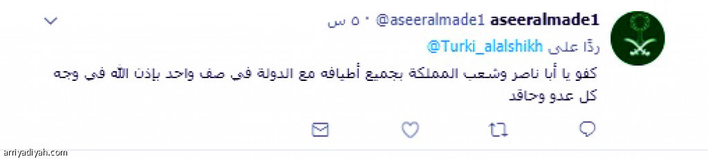 وعلَّق المغرد أسير على قضية إعلام الدويلة، قائلاً: "كفو يا أبا ناصر، وشعب المملكة بجميع أطيافه مع الدولة في صف واحد، بإذن الله، في وجه كل عدو وحاقد".