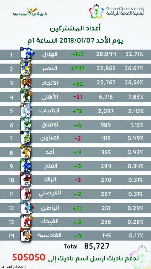 وبحسب الجدول الذي أشار إليه آل الشيخ عبر حسابه في تويتر بلغ عدد المشاركين حتى الساعة 1 من ظهـــر أمس "85.727" مشتركاً، وشهــــد الجدول تراجعاً للاشتراك في أندية الأهلي والرائد والتعاون.