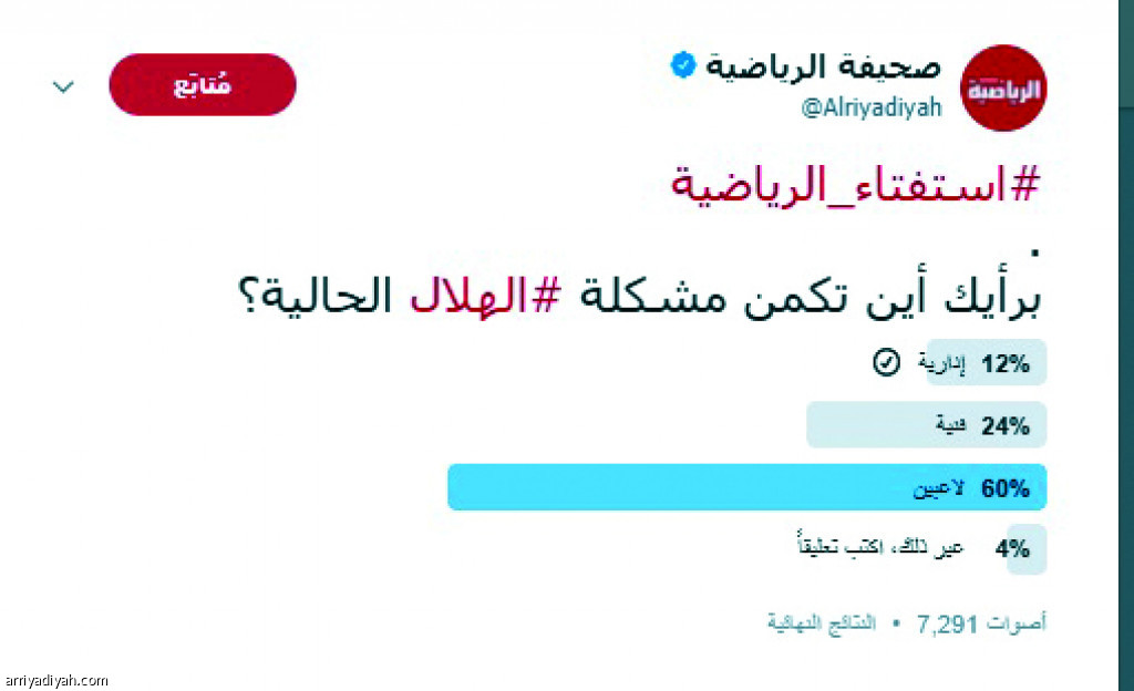 اتفق 60 في المئة من المصوتين عبر استفتاء الرياضية الذي طرحته أمس عبــــر حســـابهـا الرســــمي على موقــع التواصل الاجتماعي تويتر حول مشكلة الهلال الحالية في أنها تعود للاعبين.
