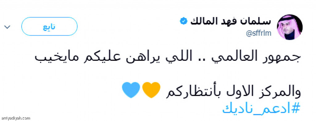 تفاعـلـت الجمـاهيـــر النصراوية مع تغريدة سلمان المالك رئيس نادي النصر المكلف، التي طالبهم فيهـا بالحصـول على المركز الأول في حملة "ادعم ناديك".