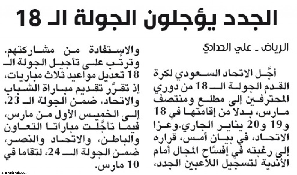 أجَّل الاتحاد السعودي لكرة القدم الجولة الـ 18 من دوري المحترفين إلى مطلع ومنتصف مارس، بدلاً من إقامتها في 18 و19 و20 يناير الجاري.وعزا الاتحاد، في بيانٍ أمس، قراره إلى رغبته في إفساح المجال أمام الأندية لتسجيل اللاعبين الجدد، والاستفادة من مشاركتهم.وترتَّب على تأجيل الجولة الـ 18 تعديل مواعيد ثلاث مباريات، إذ تقرَّر تقديم مباراة الشباب والاتحاد، ضمن الجولة الـ 23، إلى الخميس الأول من مارس، فيما تأجَّلت مباراتا التعاون والباطن، والاتحاد والنصر، ضمن الجولة الـ 24، لتقاما في 10 مارس.