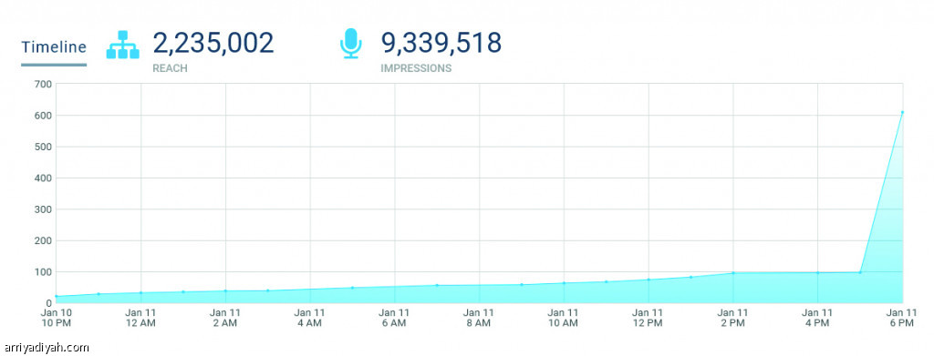 وكان عدد زوار الهاشتاق 9,339,518 وجــاءت نســبة التغريدات الأصلية 21 في المئة ونسبة الرتويت 78 في المئة، بينما جاء في المركز الأول في نسبة الدول في المشاركة من السعودية 40.74 في المئة وفي المرتبة الثانية أمريكا 37.04 في المئة وفرنسا وبريطانيا 11 في المئــة بينـما كان أغلب المشاركين في الهاشـتاق الذكور بنسبة 95.7 في المئة ونسبة الإناث 4.3 في المئة.