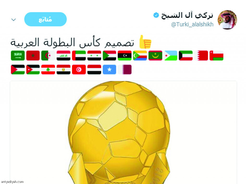 ونشر تركي آل الشيخ عبر حسابه الرسمي في "تويتر" تغريدة مرفقة بصورة للتصميم الجديد لكأس البطولة العربية مصحوبة بأعلام جميع الدول العربية، مضيفاً: "تصميم كأس البطولة العربية".