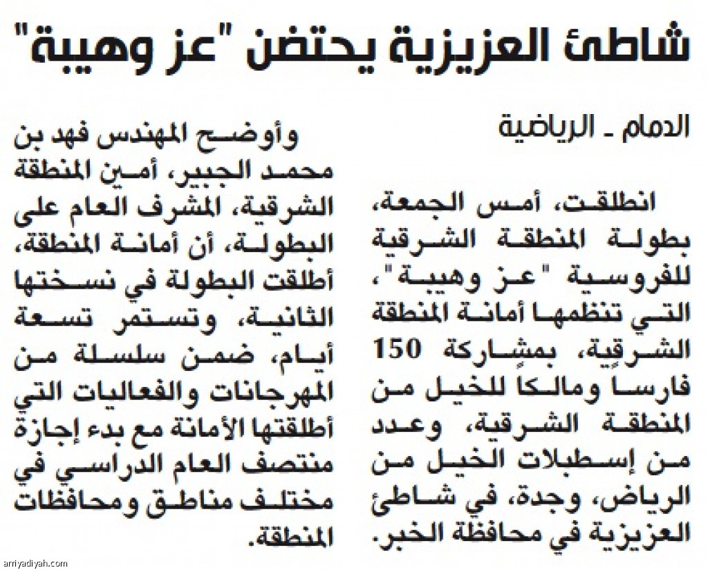انطلقت، أمس الجمعة، بطولة المنطقة الشرقية للفروسية "عز وهيبة"، التي تنظمها أمانة المنطقة الشرقية، بمشاركة 150 فارساً ومالكاً للخيل من المنطقة الشرقية، وعدد من إسطبلات الخيل من الرياض، وجدة، في شاطئ العزيزية في محافظة الخبر.