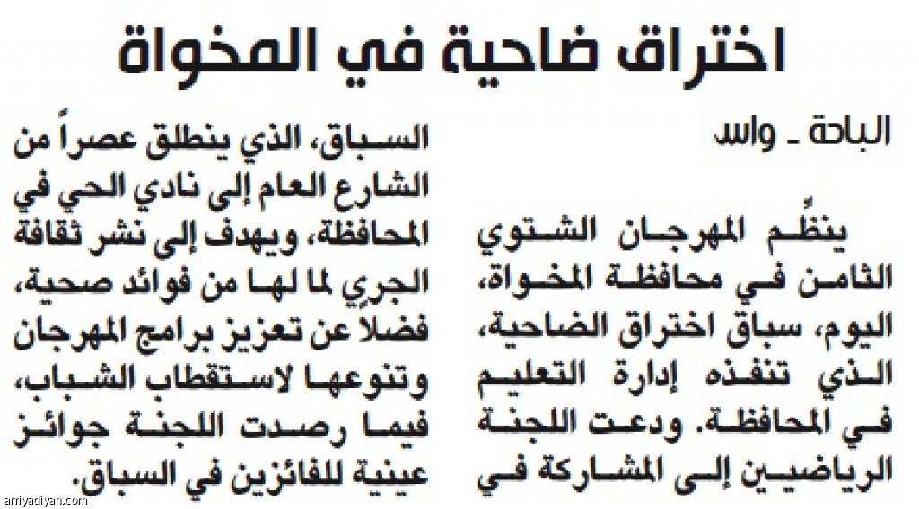ينظِّم المهرجان الشتوي الثامن في محافظة المخواة، اليوم، سباق اختراق الضاحية، الذي تنفذه إدارة التعليم في المحافظة. ودعت اللجنة الرياضيين إلى المشاركة في السباق، الذي ينطلق عصراً من الشارع العام إلى نادي الحي في المحافظة، ويهدف إلى نشر ثقافة الجري لما لها من فوائد صحية، فضلاً عن تعزيز برامج المهرجان وتنوعها لاستقطاب الشباب، فيما رصدت اللجنة جوائز عينية للفائزين في السباق.