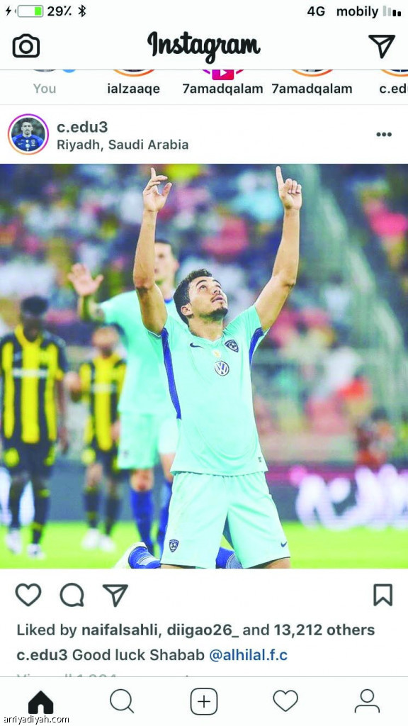 نشـــر البرازيلـــي كارلــــوس إدواردو، لاعب فريــــق الهلال الأول لكرة القدم، عبر حسابه الشخصي في "إنستجرام"، صــورة له يفـــرح بـ "أحد الأهداف في شباك فريق الاتحاد"، قبل ساعتين من انطلاق مواجهة فريقه والاتحاد أمس في الدوري.