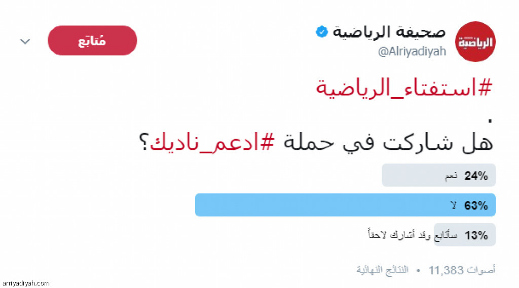 أعلن 63 في المئة من المشاركين في استفتاء "الرياضية"، الذي نشرته على حسابها في موقع التواصل الاجتماعي "تويتر"، أنهم لم يشاركوا في حملة "ادعم ناديك"، فيما قال 24 في المئة إنهم شاركوا، في حين قال 13 في المئة من المشاركين إنهم سيكتفون بالمتابعة، وقد يشاركون لاحقاً.