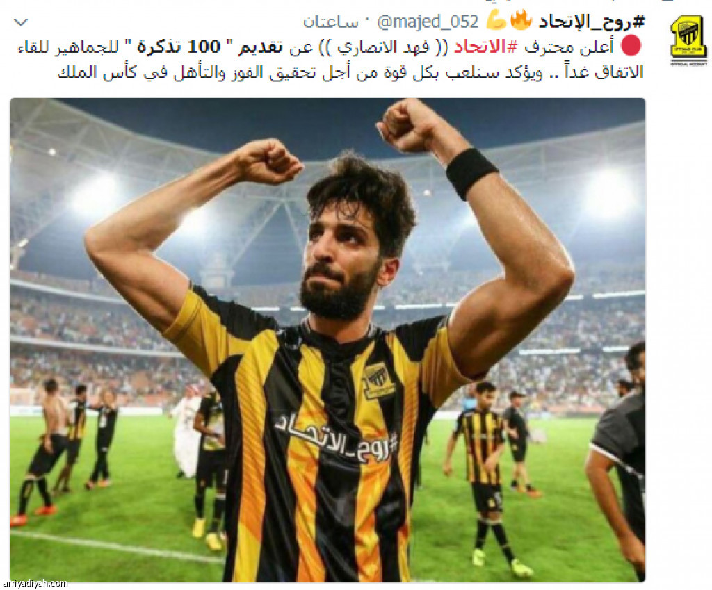 قدم الخماسي كارلوس فيلانويفا وفهد المولد وفواز القرني وعمار النجار وخالد السميري لاعبو فريـق الاتحـاد أمس 1000 تذكـــرة مجانيـــة للجماهيـــر الاتحاديــة الراغـبـــة حضــــور مبــاراة فريقهــم أمـام الاتفـاق اليـــوم على ملعــب "الجوهرة المشعة" ضمن دور الـ 16 من كأس خادم الحـرمين الشـريفين.