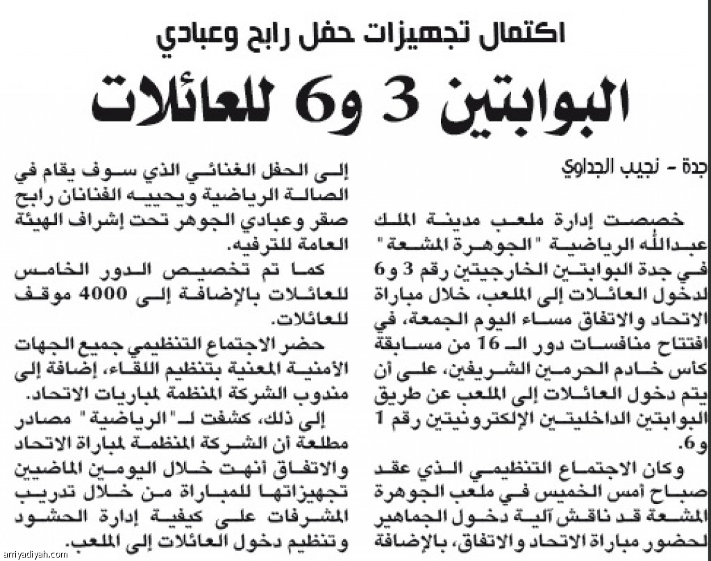 خصصت إدارة ملعب مدينة الملك عبدالله الرياضية "الجوهرة المشعة" في جدة البوابتين الخارجيتين رقم 3 و6 لدخول العائلات إلى الملعب، خلال مباراة الاتحاد والاتفاق مساء اليوم الجمعة، في افتتاح منافسات دور الـ 16 من مسابقة كأس خادم الحرمين الشريفين، على أن يتم دخول العائلات إلى الملعب عن طريق البوابتين الداخليتين الإلكترونيتين رقم 1 و6.