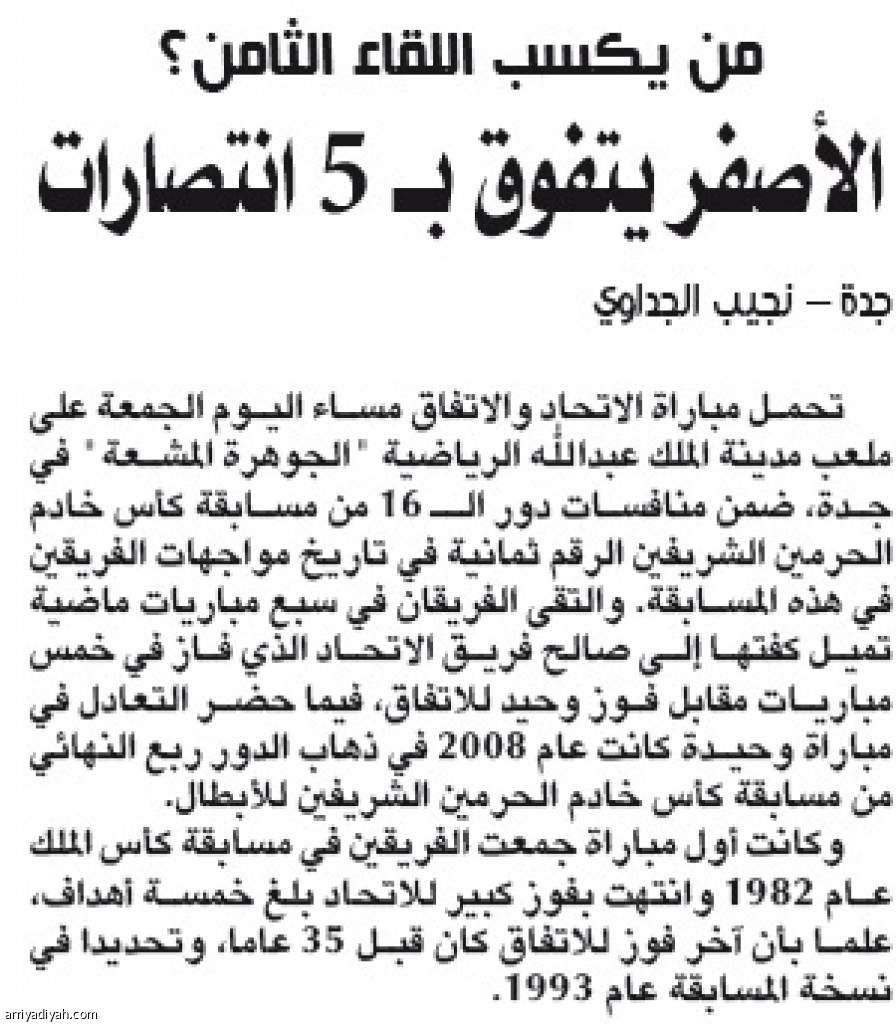 تحمل مباراة الاتحاد والاتفاق مساء اليوم الجمعة على ملعب مدينة الملك عبدالله الرياضية "الجوهرة المشعة" في جدة، ضمن منافسات دور الـ 16 من مسابقة كأس خادم الحرمين الشريفين الرقم ثمانية في تاريخ مواجهات الفريقين في هذه المسابقة. والتقى الفريقان في سبع مباريات ماضية تميل كفتها إلى صالح فريق الاتحاد الذي فاز في خمس مباريات مقابل فوز وحيد للاتفاق، فيما حضر التعادل في مباراة وحيدة كانت عام 2008 في ذهاب الدور ربع النهائي من مسابقة كأس خادم الحرمين الشريفين للأبطال.
