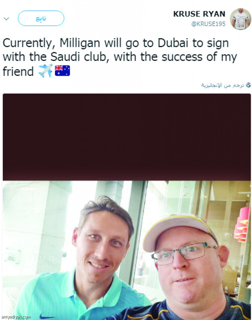 غرد الأسترالي كروس ريان بصورة له مع صديقه الأسترالي مارك ميليجان، لاعب فريق ملبورن فيكتوري، وعلق أعلى الصورة قائلا: "ذاهب إلى دبي للتوقيع مع النادي السعودي كل التوفيق والنجاح صديقي".
