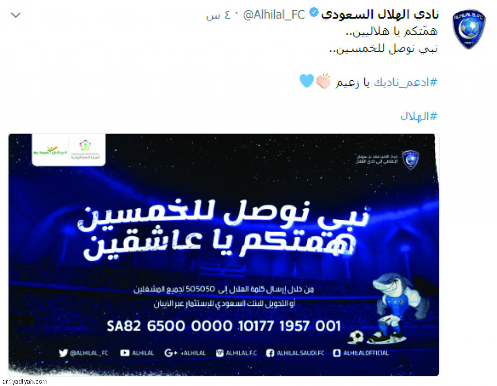 ونشر حساب الهلال على "تويتر"، صورة توضح طريقة الاشتراك في حملة "ادعم ناديك" وعلق عليها قائلاً: "همتكم يا هلاليون.. نبي نوصل للخمسين".
