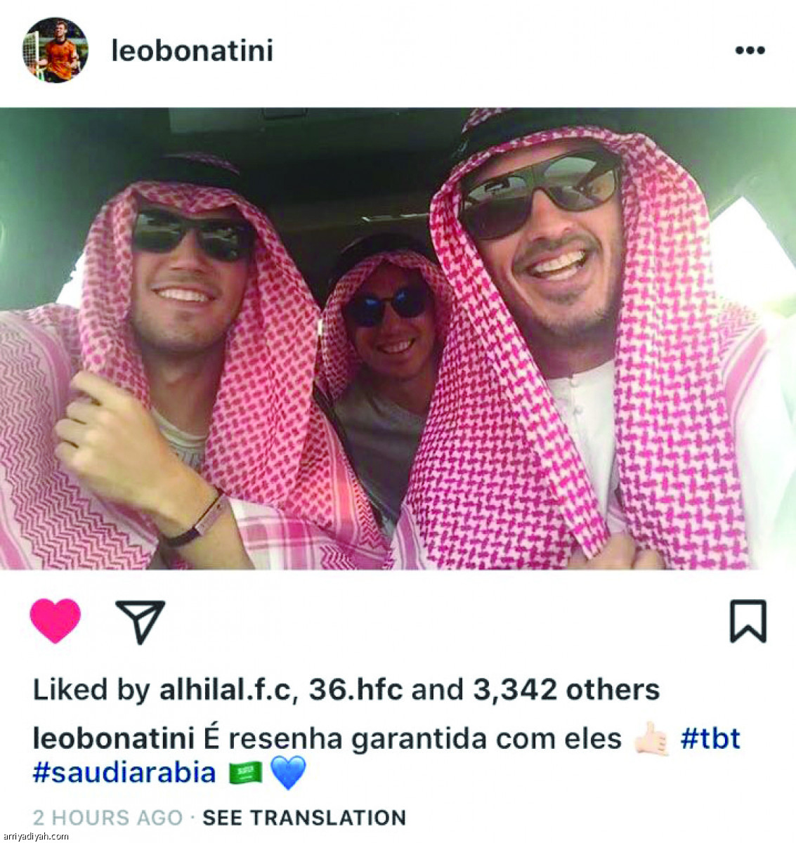 بث البرازيلي ليو بوناتيني، لاعب الهلال السابق والمنتقل إلى وولفرهامبتون الإنجليزي على سبيل الإعارة، صورة له مع أصدقائه، وهم يرتدون “الزي السعودي” الشماغ والعقال، عبر حسابه على موقع التواصل الاجتماعي إنستجرام، يذكر أن بوناتيني سجل هذا الموسم 12 هدفاً في دوري الدرجة الأولى الإنجليزي.