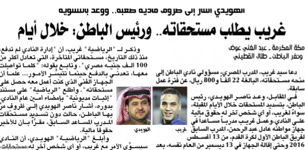 في الوقت نفسه، ذكر مصدر في الباطن، أن غريب بين آخرين لم يصرف النادي  مستحقات لهم، منهم خالد القروني، المدرب السابق للفريق الأول. وأشار المصدر إلى انتظار النادي دفعة من مستحقاته لدى رابطة دوري المحترفين السعودي لسداد مديونياتٍ.   وقاد عادل عبد الرحمن فريق الباطن في ثماني مباريات في دوري المحترفين الموسم الماضي، وأُلغي عقد جهازه في 13 ديسمبر 2016 بداعي تدهور النتائج.