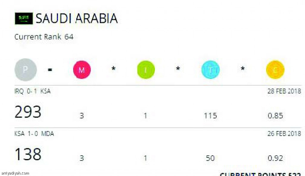 وضع تصنيف الاتحاد الدولي لكرة القدم "فيفا" مركز المنتخب السعودي الأول لكرة القدم عن شهر فبراير الجاري في المرتبة 64 على مستوى العالم، وذلك قبل الدخول في نهائيات كأس العالم بأربعة أشهر تقريباً. ومنذ تأهل المنتخب السعودي لكرة القدم إلى أول نهائيات في موسم 1994 في الولايات المتحدة الأمريكية، تواتر تصنيف الأخضر في منتصف الثلاثينيات على مستوى العالم. ويعد أفضل تصنيف للأخضر في شهر فبراير عن موسم 1995 إذ احتل الأخضر المرتبة الـ27 على مستوى العالم، فيما كان أسوأ تصنيف للأخضر فبراير موسم 2013 باحتلاله المرتبة الـ108.
