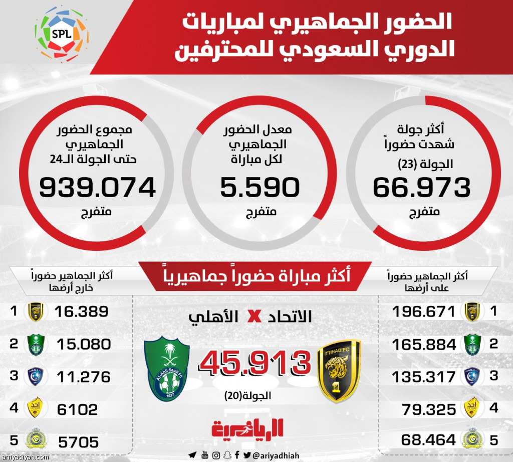 هذا وشهد ديربي جدة بين الاتحاد والأهلي، في الجولة الـ20 حضور 45.913 متفرجاً، في ملعب "الجوهرة المشعة" كأكثر مباراة حضوراً جماهيرياً.