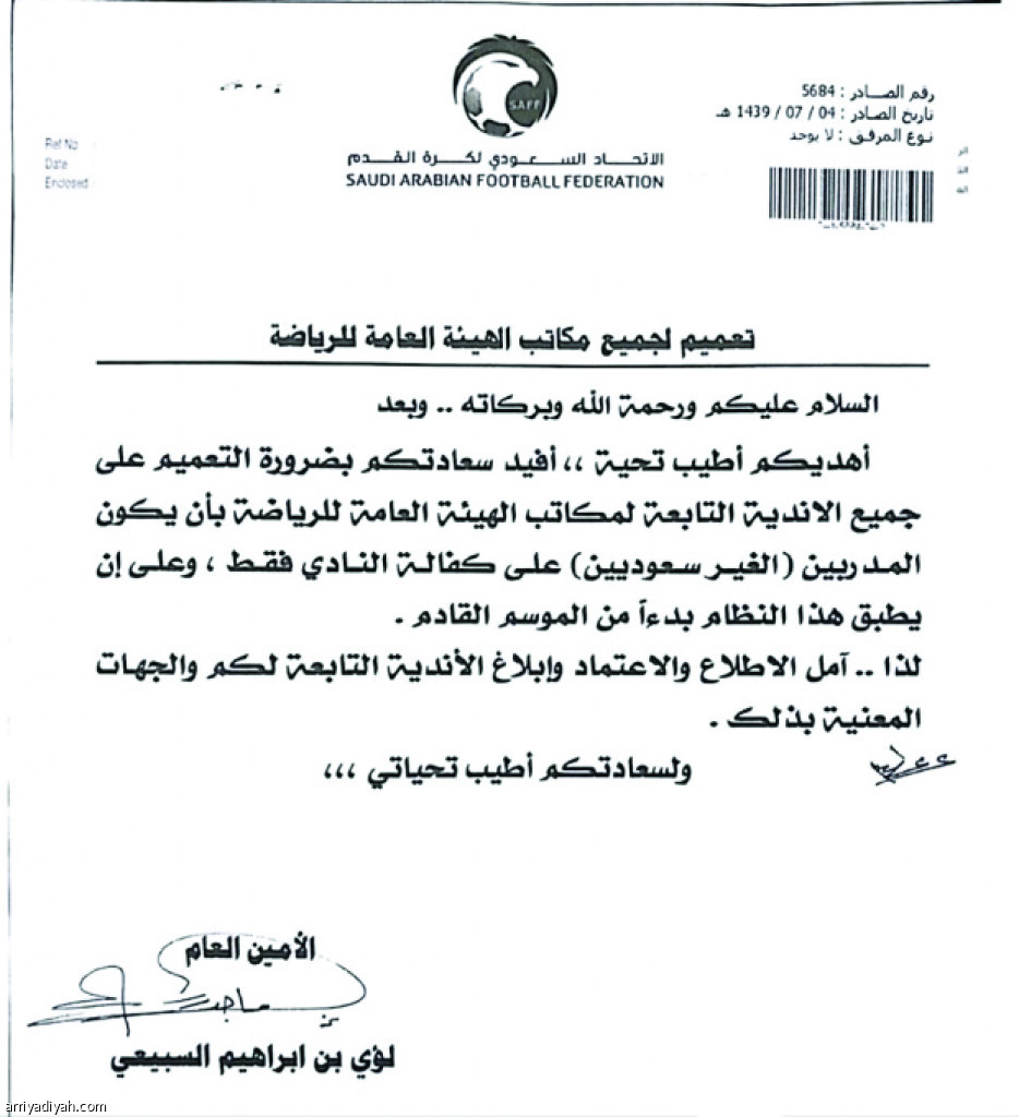 وطلب لؤي السبيعي، الأمين العام للاتحاد، في تعميم، وصل إلى مكاتب الهيئة العامة للرياضة، إبلاغ الأندية التابعة للمكاتب، والجهات المعنية بالنظام الجديد.