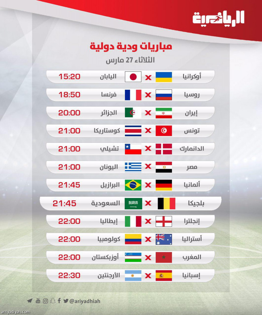 يستضيف ملعب الملك بودوان في العاصمة البلجيكية بروكسل اليوم الثلاثاء مباراة المنتخب السعودي الأول لكرة القدم ونظيره البلجيكي الودية، فيما يستضيف منتخب إسبانيا نظيره الأرجنتيني، وتلعب البرازيل في ضيافة ألمانيا بطلة العالم، في أبرز اللقاءات الودية استعداداً لنهائيات مونديال 2018 الذي تستضيفه روسيا من 14 يونيو إلى 15 يوليو.