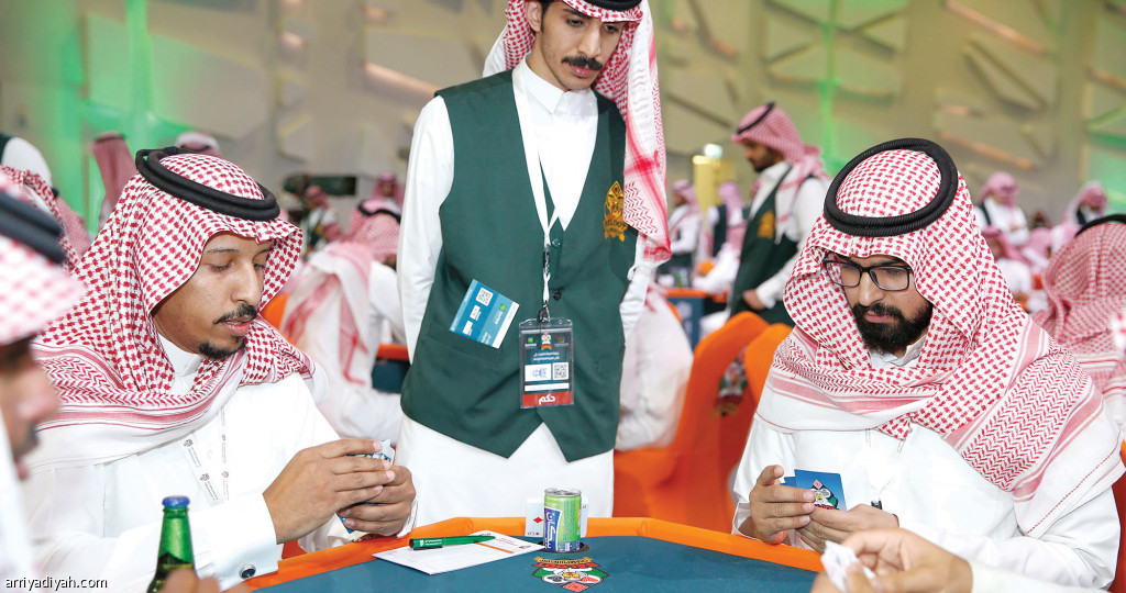 يستغل حكام بطولة البلوت فترة الراحة بين الجولات ويقومون بممارسة اللعبة والتحديات بينهم.
