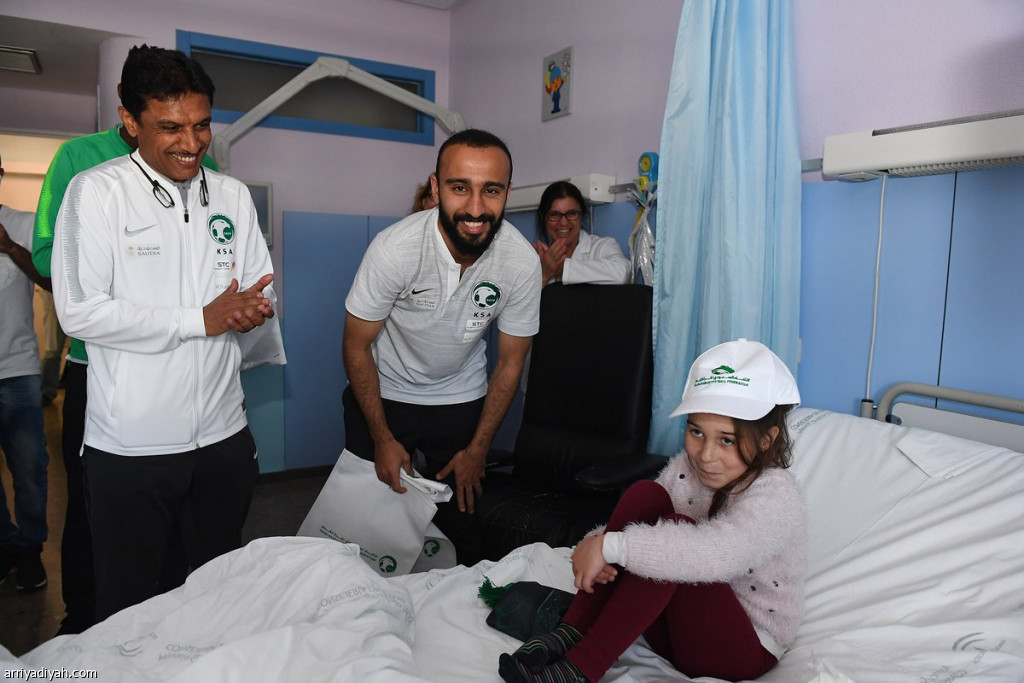 وكان في استقبال الوفد مدير المستشفى الدكتور توركاواتو روميرو، ورئيس قسم طب الأطفال الدكتور خافير الباريز، وتجول الوفد في قسم تنويم الأطفال والتقوا بالأطفال وقدموا الهدايا التذكارية لهم. وقدم عمر باخشوين في ختام الزيارة درعًا تذكاريًا لمدير المستشفى الدكتور توركاواتو روميرو الذي بدوره قدم شكره وتقديره للاتحاد السعودي لكرة القدم على هذه البادرة الرائعة على حد وصفه، مؤكدًا أن هذه الزيارة كانت لها ردود إيجابية على الأطفال المرضى، وأسهمت في رسم الابتسامة. من جانبه أوضح عضو مجلس إدارة الإتحاد السعودي مدير المنتخب عمر باخشوين أن المنتخب لديه رسالة سامية يبعثها من المملكة العربية السعودية في كل معسكر نقيمه لنوضح بأن ثقافة كرة القدم ليست فقط داخل المستطيل الأخضر بل تحوي رسالة أسمى تصل لجميع المجتمع . وأبدى باخشوين سعادته بهذه الزيارة لتحقيقها الهدف المنشود منها إسعاد الأطفال، مؤكدًا أن هذه الزيارة تأتي ضمن برنامج معد من فريق الإعداد لمشاركة كأس العالم وبالشراكة مع مركز الملك سلمان للشباب .