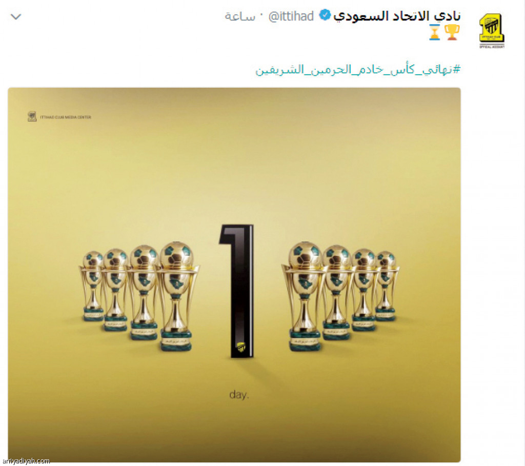 يأمل الاتحاديون التتويج بكأس خادم الحرمين الشريفين للمرة التاسعة في تاريخ النادي، وذلك على حساب منافسه الفيصلي عندما يلتقيان في النهائي، اليوم، وفك الارتباط مع نادي الهلال، حيث يتساويان في عدد مرات الفوز بالبطولة "ثماني مرات لكل منهما"، لينفرد بوصافة أكثر الفرق تتويجًا بالكأس الغالية بعد الأهلي صاحب الـ 13 بطولة. وتفاعلت الجماهير مع تغريدة لحساب نادي الاتحاد الرسمي في "تويتر"، احتوت على صورة لكؤوس الملك الثماني، التي حققها الفريق، يتوسطها "رقم واحد"، شعار الفريق، ما يعني أنهم في انتظار الكأس التاسعة.