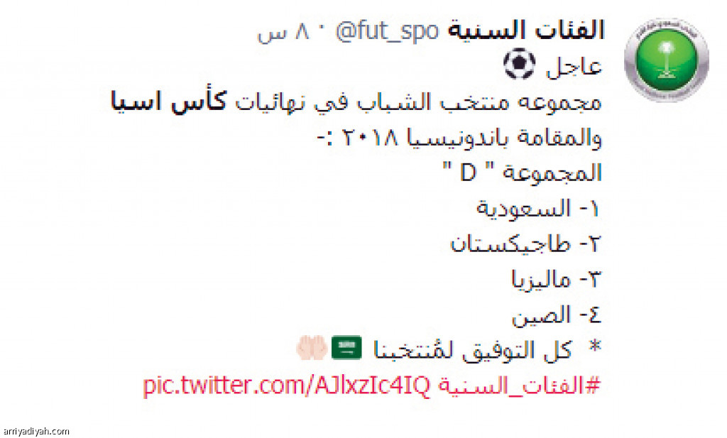 ظهرت "كأس آسيا" في 2.983 تغريدة، عبر موقع التواصل الاجتماعي "تويتر"، بعد ساعة واحدة فقط من إعلان نتيجة قرعة كأس آسيا تحت 19 عامًا، التي أسفرت عن وقوع المنتخب السعودي في المجموعة الرابعة إلى جانب منتخبات طاجيكستان وماليزيا والصين. فيما ذكرت "المجموعة الرابعة" في 1.699 تغريدة.